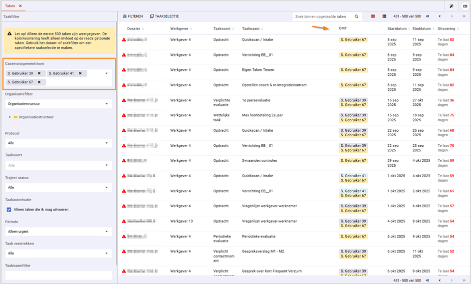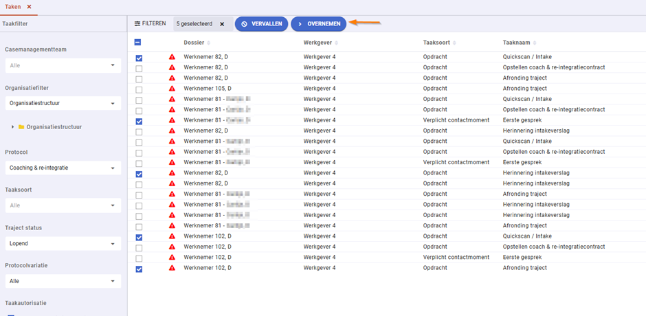 Op de startpagina kun je het Takenoverzicht vinden. Dit overzicht is onderverdeeld in Te laat, Nu uitvoeren en Komende week. Het is een korte opsomming van alle lopende taken.