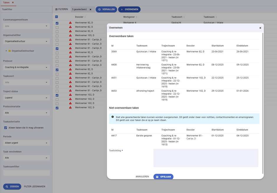 | Ook kan een taak uitgesteld worden, hier dient wel een toelichting voor ingevuld te worden. |