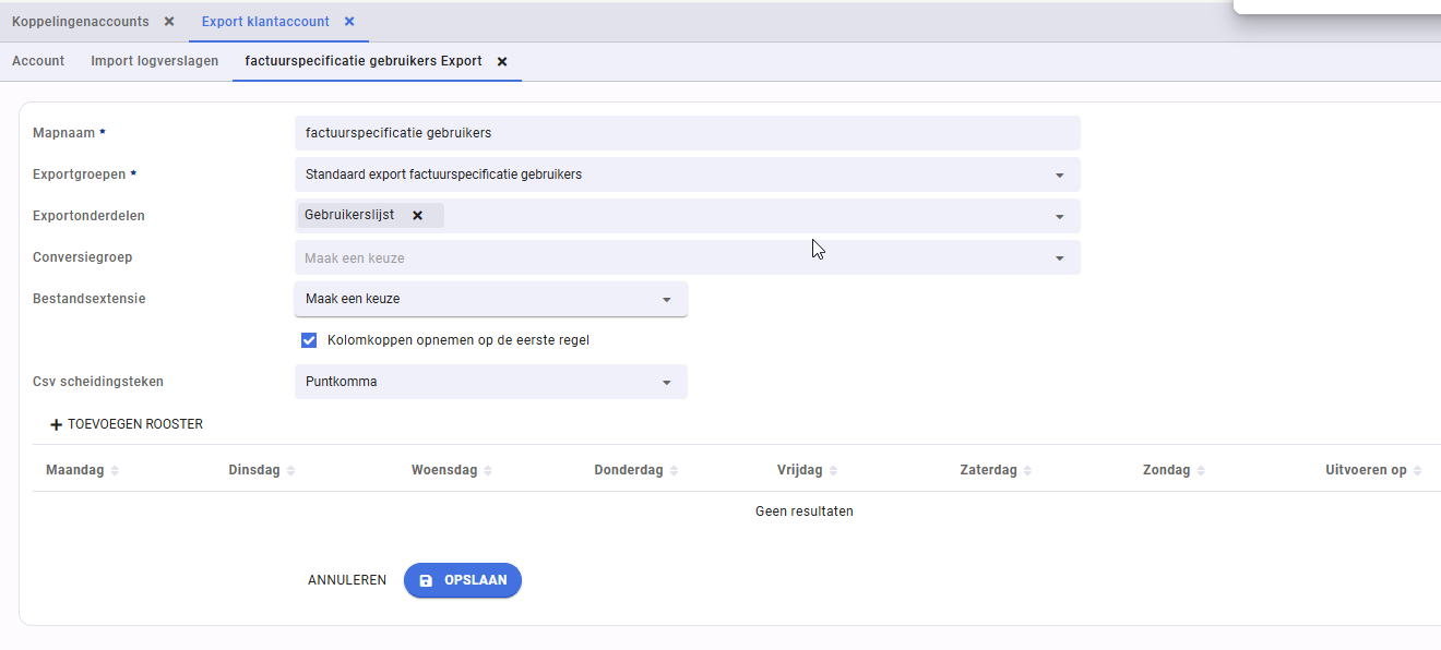 Standaard export factuurspecificatie gebruikers
