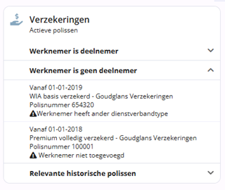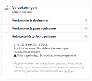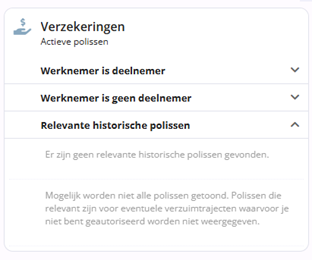 Polissen die al onder ‘Werknemer is deelnemer’ of ‘Werknemer is geen deelnemer’ vallen, worden hier niet dubbel weergegeven. Wanneer er geen relevante historische polissen zijn, wordt een melding weergegeven: ‘Er zijn geen relevante historische polissen gevonden.’.