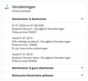 Polissen die vandaag of in de toekomst actief zijn en waarvoor de werknemer deelnemer is. Per polis wordt getoond: