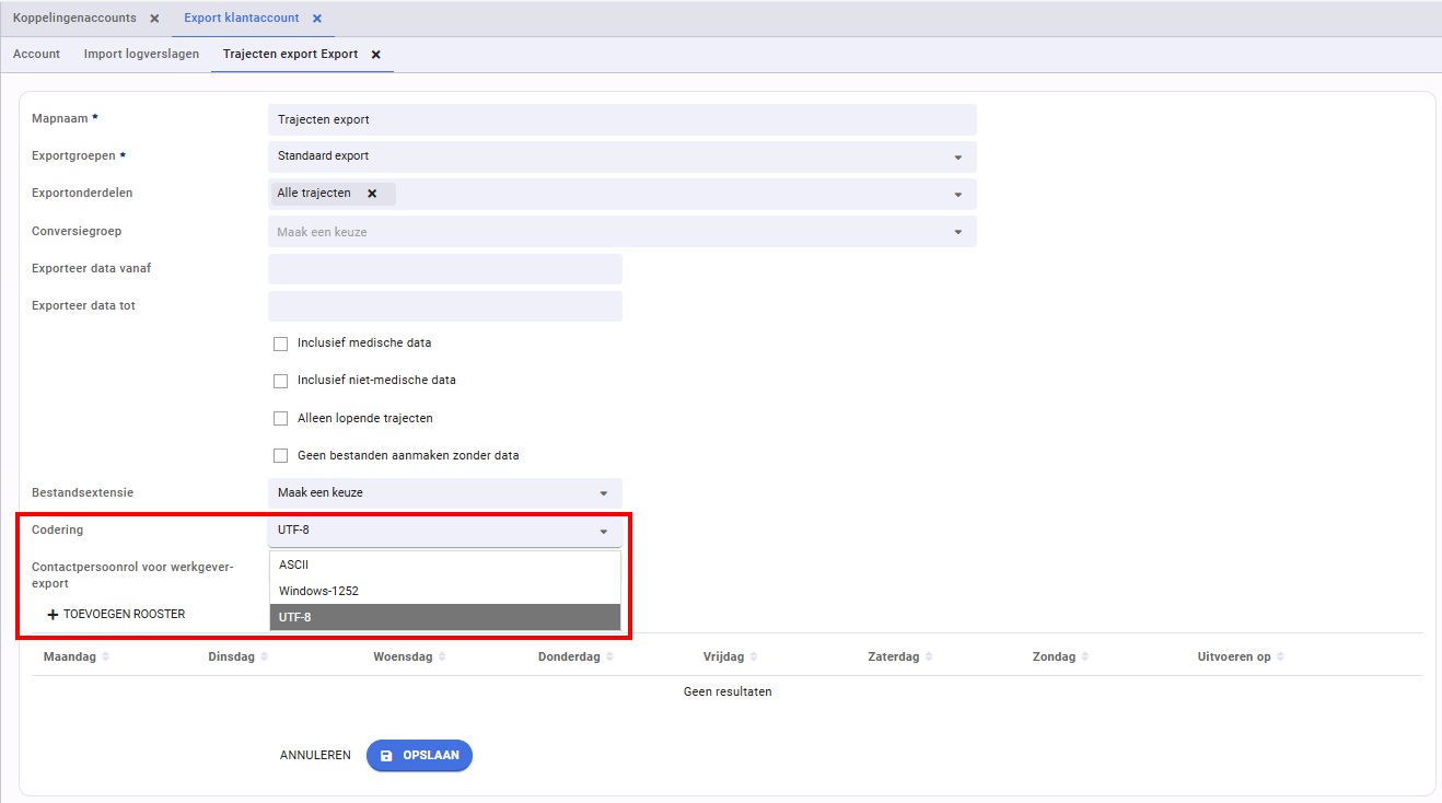 Je kunt bij iedere standaard export een encoding instellen. Wanneer je dit afstemt met de ontvangende partij ben je ervan verzekerd dat de exports goed ontvangen kunnen worden. Je kunt hierbij kiezen uit ‘UTF-8’, ‘ASCII’ en ‘Windows-1252’ formats.