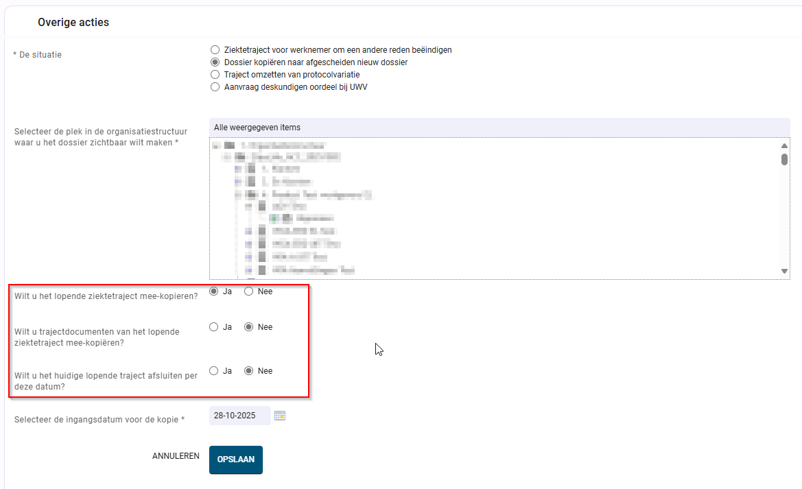 Indien er bij de huidige werknemer een lopend ziektetraject aanwezig is, heb je de mogelijkheid om dit ziektetraject mee te kopiëren. Bij de dossier-kopie zal er dan automatisch een nieuw ziektetraject worden gestart met dezelfde startdatum als bij de reeds bestaande werknemer. Dit kopie-traject kan geheel blanco worden gekopieerd, dus zonder notities, opdrachten, documenten e.d. en zal dan enkel de taken bevatten die in de protocolvariatie staan opgenomen die bij deze aparte afdeling gebruikt moet worden (bv. een specifieke ERD Ziektewet protocolvariatie). Je kan er ook voor kiezen om de documenten wel mee te kopiëren. Daarnaast kun je ook aangeven of het ziektetraject bij de huidige werknemer afgesloten moet worden.