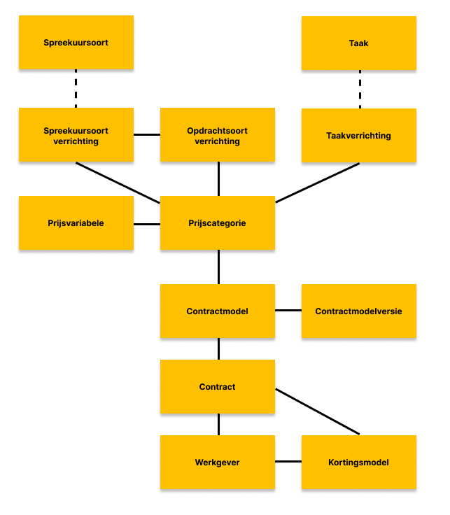 'Contractmodel' staat centraal in de structuur. Alles boven dit blokje komt samen in een contractmodel. Het conctractmodel kan bestaan uit verschillende versies die ieder een eigen inrichting kunnen hebben.