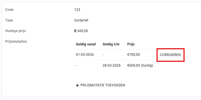 Prijsmutaties met een ingangsdatum in de toekomst kan je altijd nog wijzigen door op de knop ‘Corrigeren’ te klikken achter de prijsmutatie.