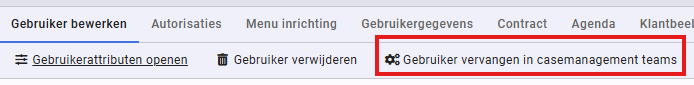 Klik vervolgens op het account van de gebruiker die vervangen gaat worden. Klik bovenin op Gebruiker vervangen in casemanagement teams.