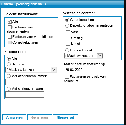 Het genereren van de conceptfacturen (en daarna de definitieve facturen) doe je op basis van een aantal selectieparameters: