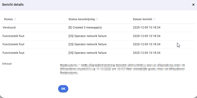 Voorbeeld van een uitval bericht. Bij inhoud staat de tekst die naar de medewerker is verstuurd, bijvoorbeeld een afspraak bevestiging.
