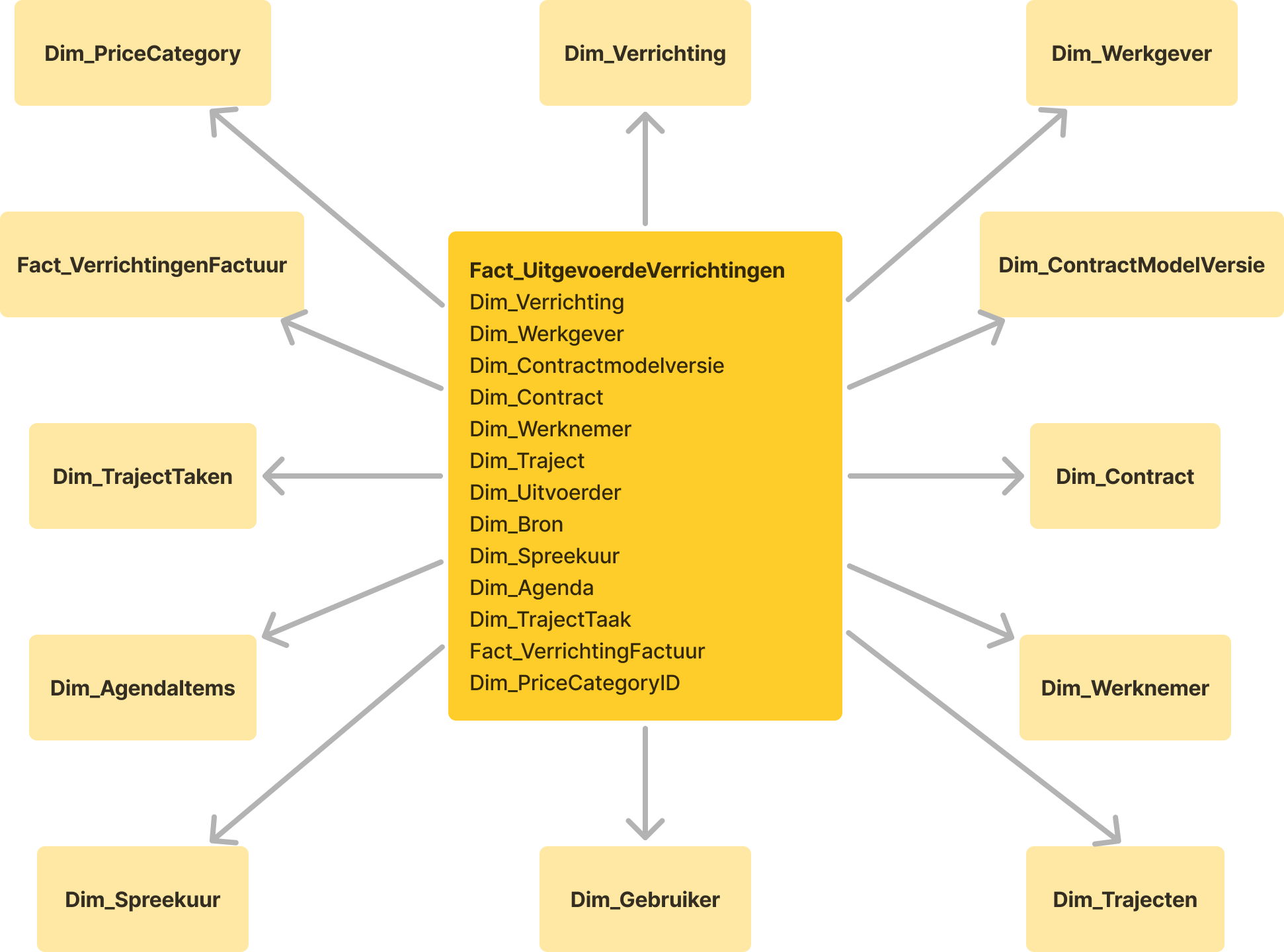 Hiermee vormt Fact_UitgevoerdeVerrichtingen de schakel tussen planning en uitvoering (agenda/spreekuur/taak), de organisatorische context (werknemer/werkgever/traject) en de contractuele en financiële vastlegging (contract/modelversie/price category en factuur).