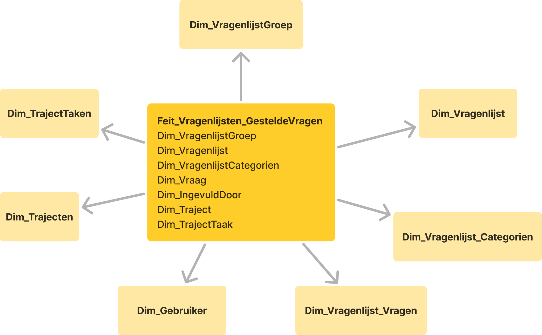 Het feit legt een koppeling naar de groep waaronder de vragenlijst is geplaatst (Dim_VragenlijstGroep). Daarnaast is er een koppeling naar de vragenlijst zelf (Dim_Vragenlijst) zodat kan worden achterhaald tot welke vragenlijst de vraag behoort. De vragen zijn ook gekoppeld aan de bijbehorende categorieën binnen een vragenlijst via Dim_Vragenlijst_Categorieën. Elke gestelde vraag is verbonden met de betreffende vraagdefinitie (Dim_Vragenlijst_Vragen) waarin informatie zoals de inhoud, het type vraag (open, meerkeuze, tijd, etc.) en of de vraag verplicht is om te antwoorden zijn vastgelegd. Tot slot zorgt de koppeling met Dim_IngevuldDoor ervoor dat inzichtelijk is wie de vragenlijst heeft ingevuld.