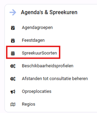 1. Ga naar Beheer > Dienstverlening > Blok ‘Agenda’s & Spreekuren’ > Spreekuursoorten.