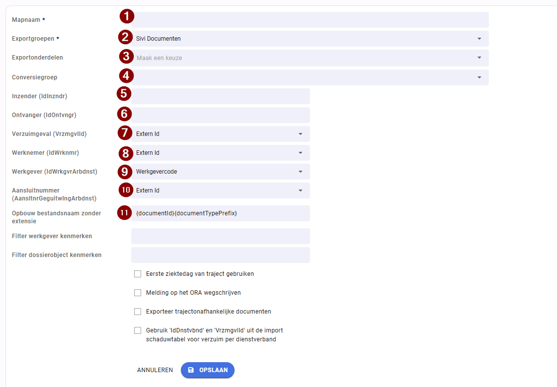 Als hier niets ingevuld staat, zal de documentenexport voor alle werkgevers en werknemers in het klantaccount de geconfigureerde documenten exporteren. Het instellen van een bepaald werkgeverkenmerk resulteert in een documentenexport voor alle werkgevers van het koppelingenaccount die het ingevulde kenmerk bevatten. Het instellen van een bepaald dossierobjectkenmerk resulteert in een documentenexport alleen voor de werknemers die binnen de scope van het koppelingenaccount vallen èn het betreffende kenmerk bevatten. In deze velden moet de kenmerkcode worden ingevuld.