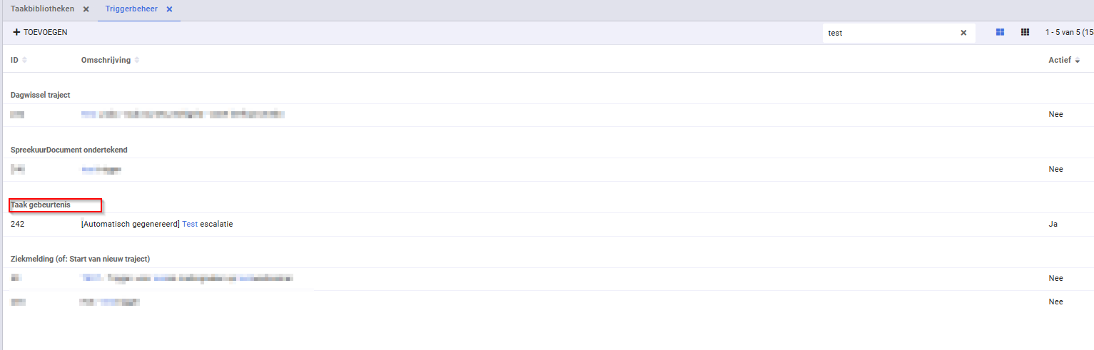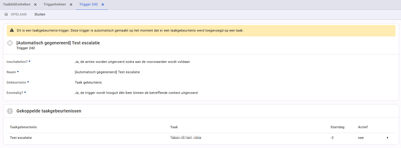 Op het moment dat een taakgebeurtenis nieuw is aangemaakt, wordt er op de achtergrond een niet-beheerbare trigger aangemaakt. Deze trigger heeft wat andere kenmerken dan de triggers die we tot nu toe kenden. In triggerbeheer zie je in het overzicht dat er een groepering is bijgekomen, namelijk ‘Taak gebeurtenis’.