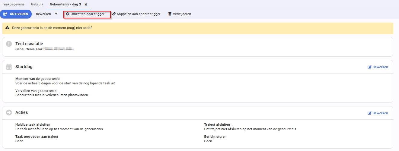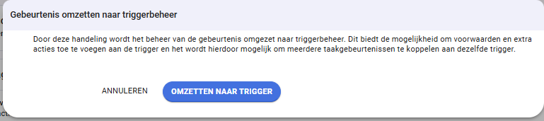 Om bovenstaande te kunnen doen, klik je in de taakgebeurtenis op de knop ‘Omzetten naar trigger’.