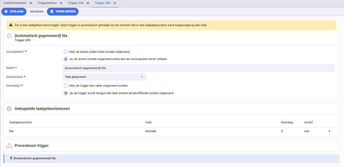 - Is de trigger - die automatisch was gegenereerd - beheerbaar geworden. Nu kun je indien gewenst nog extra voorwaarden toevoegen. Daarnaast kun je nu ook acties toevoegen die vanuit een taakgebeurtenis niet mogelijk waren om toe te voegen, maar die bij triggers wel bekend zijn als acties.