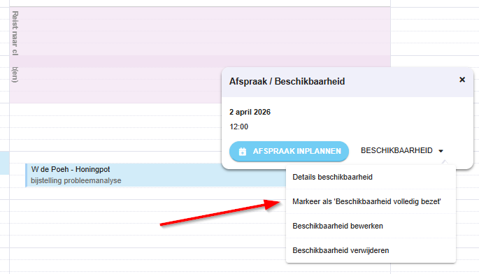 Als er geen oproepverzoek is aangemaakt, maar wel een afspraak gepland wordt, kan ook de nieuwe planning assistent worden gebruikt via Acties in de agenda. De planner dient de afspraakgegevens in te voeren, waarmee geschikte afspraakmogelijkheden opgehaald kunnen worden.