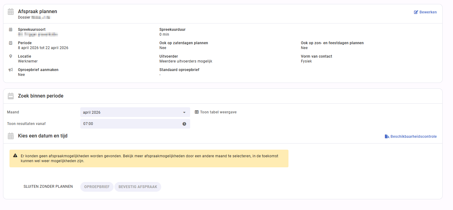Na het selecteren van ‘alle uitvoerders’ en het vervolgen van plannen, worden de afspraakmogelijkheden opgehaald zonder te filteren op een specifieke uitvoerder.Casemanagementteam: