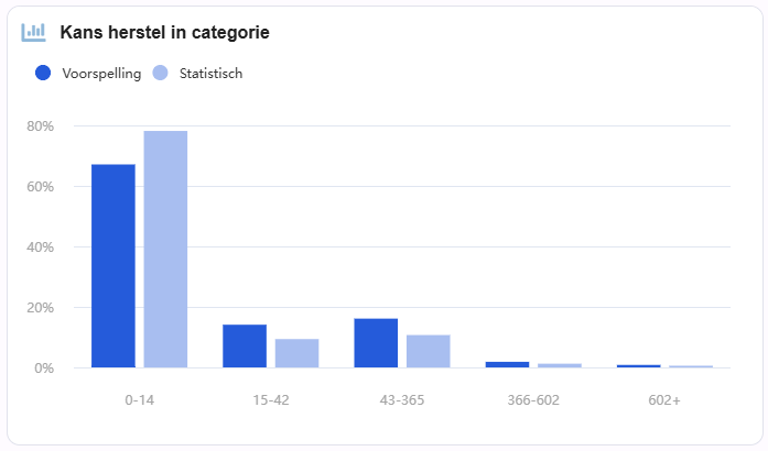 De duurcategorie voorspeller maakt een inschatting in welke categorie ( 0-14 / 15-42 / 42-365 / 366-602 / 602+ (dagen)) men naar verwachting hersteld. Dit wordt uitgedrukt in een waarde of in een percentage. Er zijn vijf categorieën zichtbaar met de bijbehorende voorspelling en de kans dat het verzuim in een categorie valt. De lichte staafjes laten de statistische kans zien zonder inmenging van AI. Deze kijkt naar de huidige verzuimduur en toont hoe de categorieën zijn verdeeld. De donkere staafjes laten de voorspelling zien die Hyperlab doet op basis van de data.