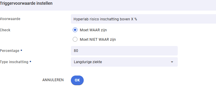 Er kunnen triggers gemaakt worden die gebruik maken van een triggervoorwaarde op basis van de Hyperlab AbsencePredictor. Deze triggervoorwaarde heet 'Hyperlab risico inschatting boven X %'. Triggers met deze voorwaarde kunnen ingesteld worden om af te gaan op vier verschillende typen inschattingen. Deze trigger kun je bijvoorbeeld zo instellen dat als de AI voorspelling of de Statistische kans groter is dan 60% dat deze gaat herstellen in categorie 43-365, dat dan actie/proces X wordt getriggerd.