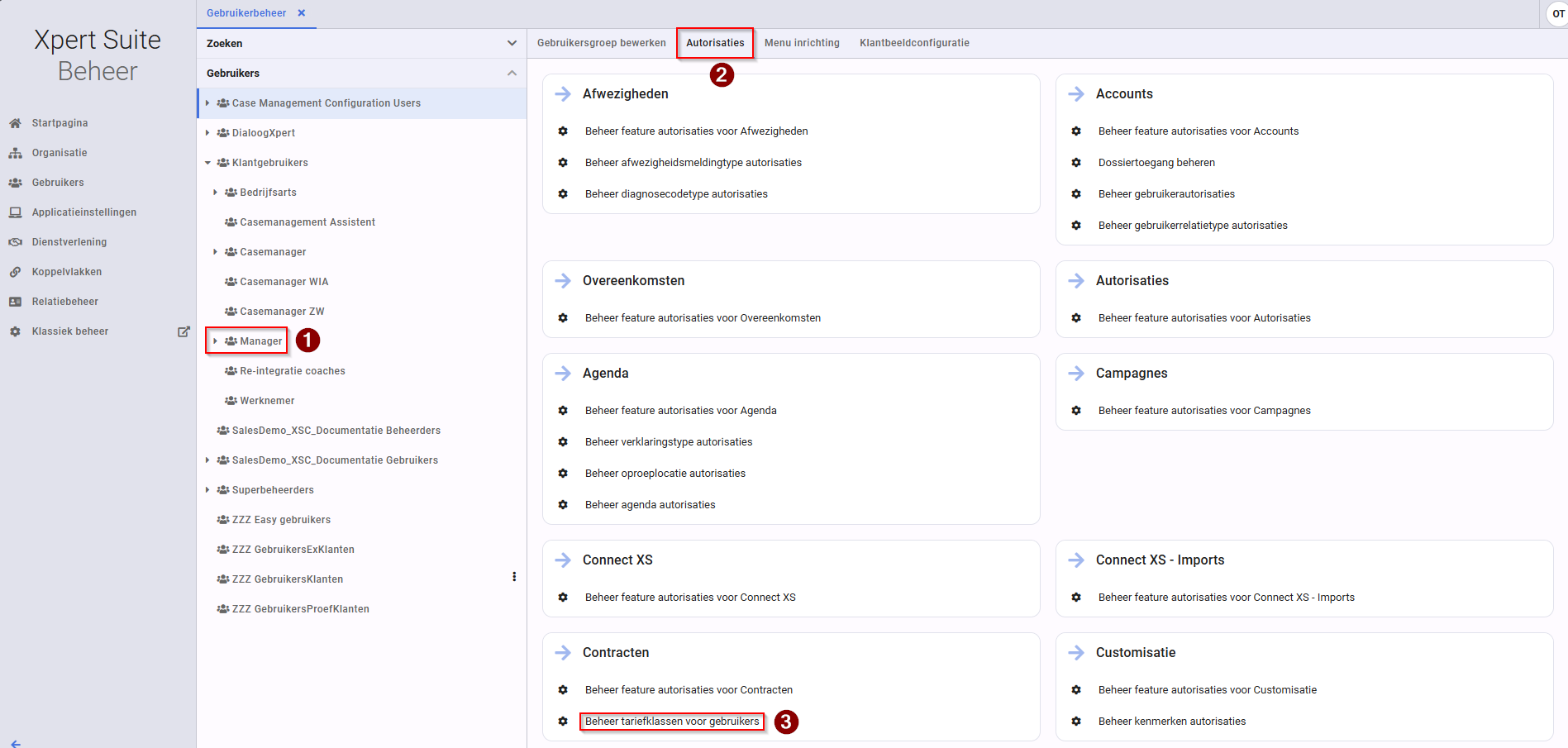- Ga naar het menu "Gebruikers" in Xpert Suite Beheer. Afhankelijk van welk wijze autorisaties worden ingeregeld;
