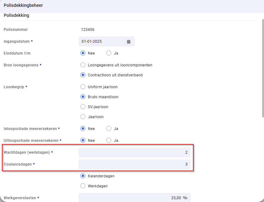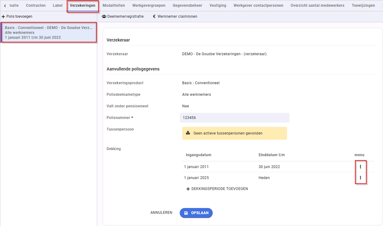 Deze staan ingesteld bij 'werkgever' > 'Verzekeringen' > bij de polis > puntjes achter de dekkingsperiode > 'Polisdekkingbeheer'.