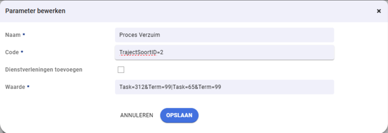 - Vul bij Code de Protocol ID's in op basis van het volgende template: TrajectSoortID=X. Bijvoorbeeld TrajectSoortID=2