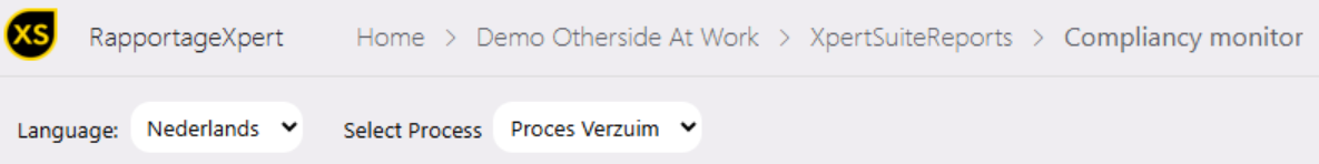 Proces: De Compliancy monitor heeft een filter 'Select process', die weergeeft welk proces gemonitord wordt. Deze naam kan vrij gekozen worden.